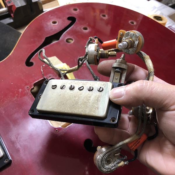 Fホールのサイズがそこそこあって、ポットの出し入れが出来る場合は、ピックアップの穴から取り出す必要は有りません。