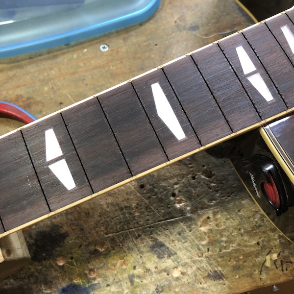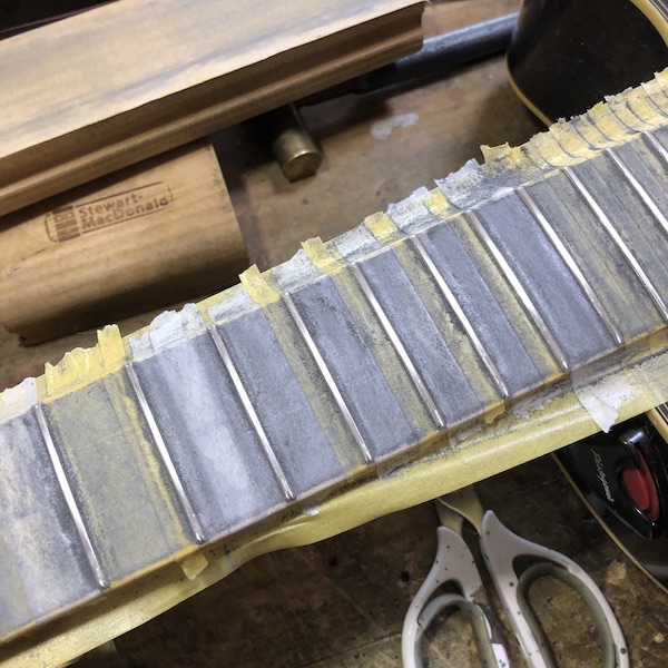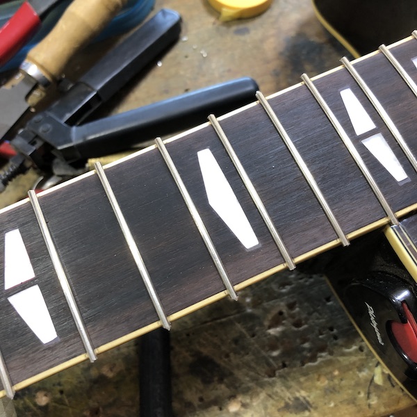プレイスタイルによってはすり合わせでもOKレベルですが、『高めが好み』との事でもございますので、レスポール程度のフレットへの交換をしていきます。